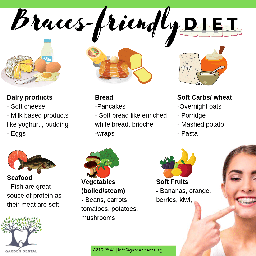 - Breakfast - Oatmeal, cooked to a soft consistency, is gentle on braces and a good source of fiber.